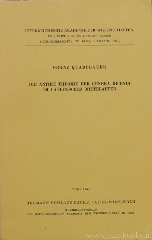 QUADLBAUER, F.Die antike Theorie der genera dicendi im lateinischen Mittelalter. Vorgelegt in der Sitzung am 7. Februar 1962.Wien, Böhlau, 1962.