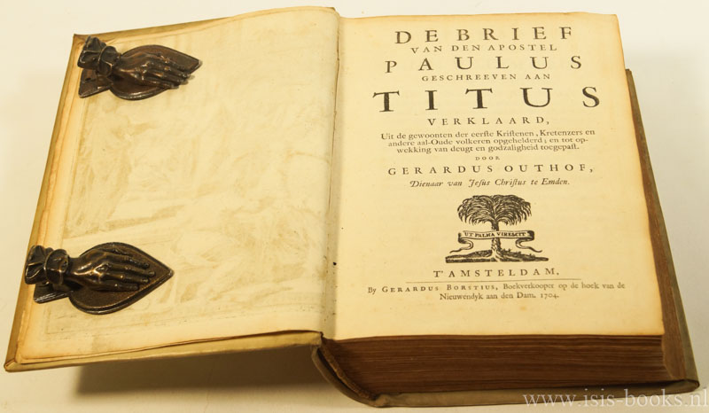 OUTHOF, GERARDUSDe brief van den apostel Paulus geschreeven aan Titus verklaard, uit de gewoonten der eerste Kristenen, Kretenzers en andere aal-oude volkeren opgehelderd; en tot opwekking van deugt en godzaligheid toegepast.Amsterdam, Gerardus Borstius, 1704.