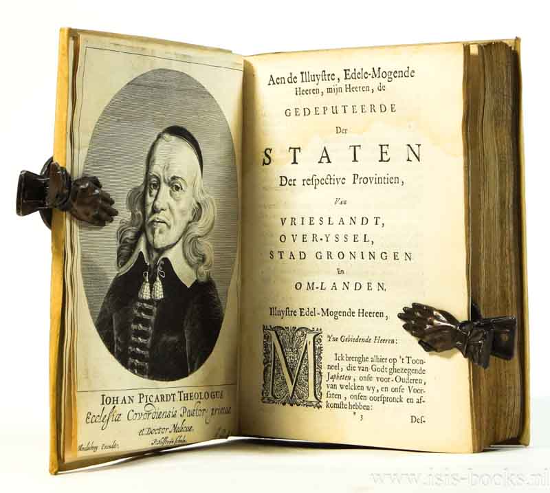 Met 1 uitvouwbare kaart van Drenthe, 6 uitvouwbare platen, 2 enkele platen en 8 portretten (waaronder dat van Picardt). Perkament. 4to. (XVI), 302 pp. *lichte waterschade op kaart, enkele platen en hier en daar in de tekst, verder goed exemplaar*