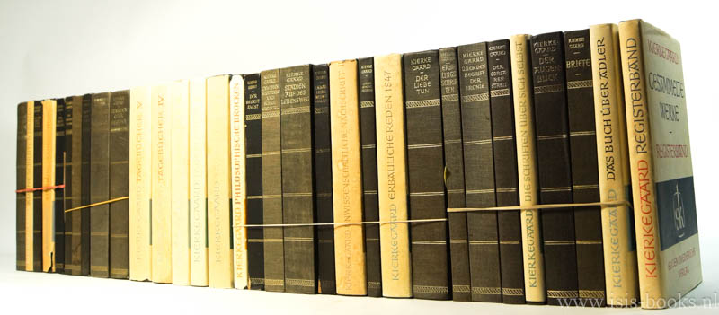 Volume 1: Entweder / Oder. Erster Teil. Volume 2: Entweder / Oder. Zweiter Teil. Volume 3: Furcht und Zittern. Volume 4: Die Wiederholung. Drei Erbauliche Reden 1843. Volume 5: Erbauliche Reden 1843/1844. Volume 6: Philosophische Brocken. Volume 7: Der Begriff Angst. Vorworte. Volume 8: Vier Erbauliche Reden 1844. Drei Reden bei Gedachtengelegenheiten 1845. Volume 9: Stadien auf des Lebens Weg. Volume 10: Abschliessende unwissenschaftliche Nachschrift zu den philosophischen Brocken. Erstel Teil. Volume 11: Abschliessende unwissenschaftliche Nachschrift zu den philosophischen Brocken. Zweiter Teil. Volume 12: Eine literarische Anzeige. Volume 13: Erbauliche Reden in verschiedenem Geist. Volume 14: Der Liebe tun. Volume 15: Christliche Reden 1848. Volume 16: Kleine Schriften 1848/49. Volume 17: Die Krankheit zum Tode. Volume 18: Einübung im Christentum. Volume 19: Erbauliche Reden 1850/51. Zur Selbstprüfung der Gegenwart anbefohlen. Urteil selbst. Volume 20: Erstlingschriften. Volume 21: Über den Begriff Ironie mit besonderer Rücksicht auf Sokrates. Volume 22: Der Corsarenstreit. Kleine Aufsätze 1842/51. Volume 23: Der Schriften über sich selbst. Volume 24: Der Augenblick. Volume 25: Briefe. Volume 26: Das Buch über Adler. + Registerband. + Tagebücher volume 1-5 Ausgewählt, übersetzt und erläutert von Hayo Gerdes.