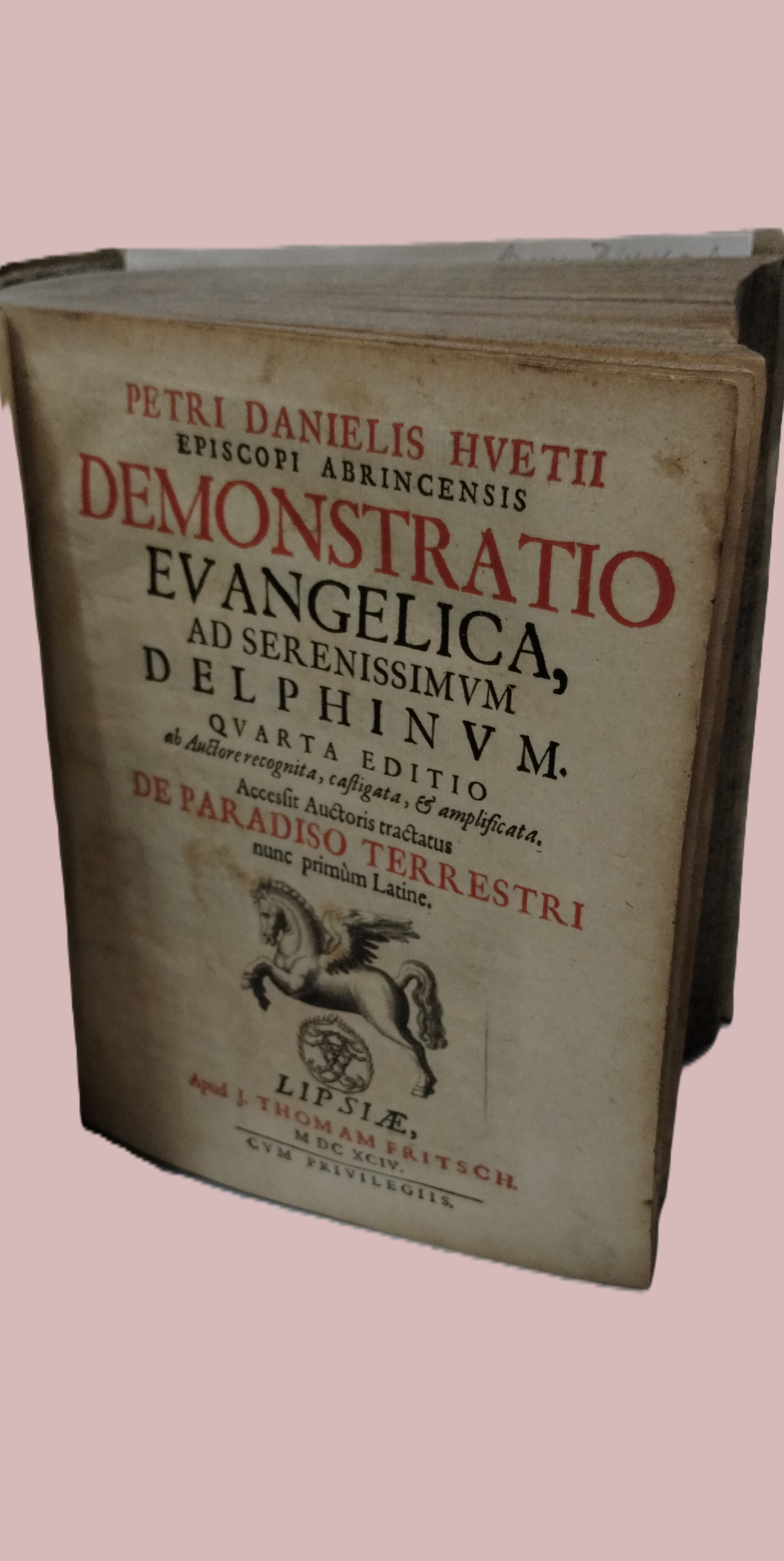 HUET, PIERRE DANIEL Demonstratio evangelica, adserenisimum delphinum , Quarto editio ad auctore recognita, castigata, & amplificata Accesit auctoris tractatus De paradiso terrestri nunc primum Latine.Leipzig, Thomas Fritsch, 1694.