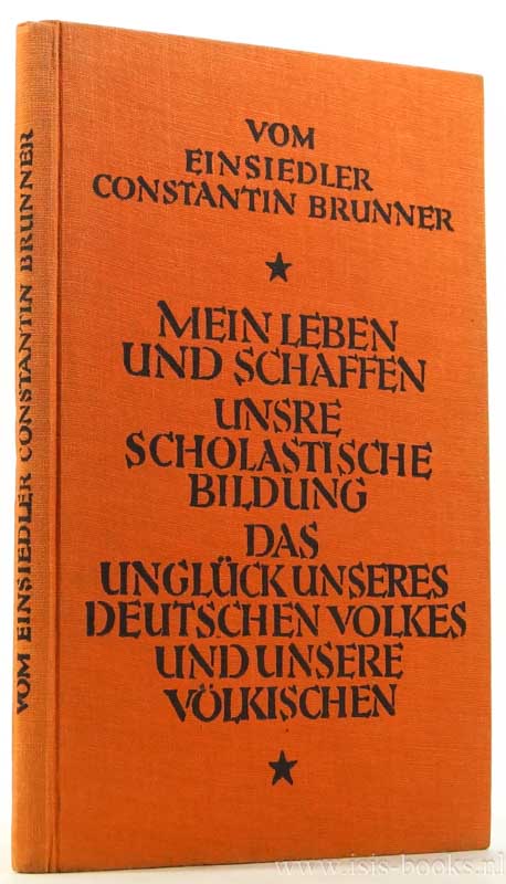 BRUNNER, C. (LEOPOLD WERTHEIMER)Vom Einsiedler Constantin Brunner. Mein Leben und Schaffen. Unsre scholastische Bildung. Das Unglück unsres deutschen Volkes und unsre 'Völkischen'. Potsdam, Kiepenheuer, 1924.
